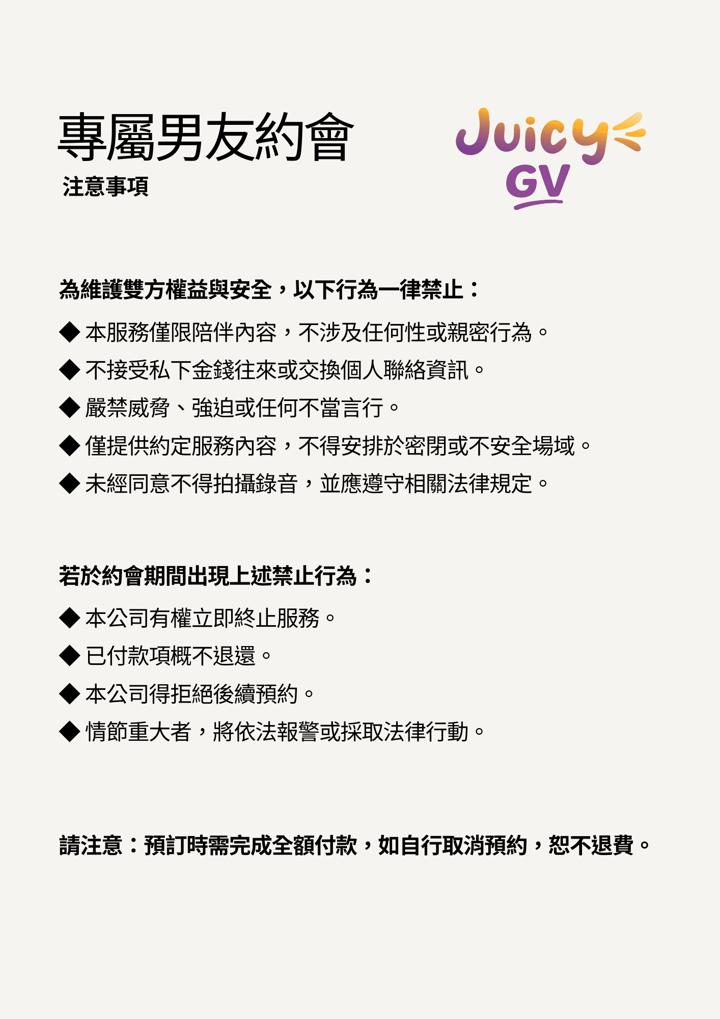 我們的商店不是提供性服務。萬一在約會期間邀請發生性關係、談論父親契約、甚至試圖親吻或擁抱,約會將被取消。 (不予退款)此外,我們不能接受直到男孩無法搭乘末班車回家為止的日期。 (只有經我們批准的演員(25歲以上演員)才可以在末班車後去約會。如果我們預計演員趕不上末班車,我們將收取出租車費用提前購買票價。日期(基本上從早上6 點到末班車)也完全禁止在SNS、公告牌等上發布或撰寫有關日期詳細資訊或演員評論的內容。